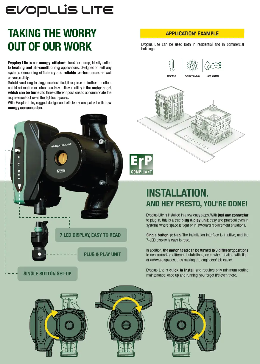 DAB Evoplus Lite, ısıtma ve iklimlendirme sistemleri için tasarlanmış enerji verimli bir sirkülasyon pompasıdır. Verimlilik, güvenilirlik ve çok yönlülüğü bir arada sunar; montajdan sonra rutin bakım dışında herhangi bir müdahale gerektirmez.